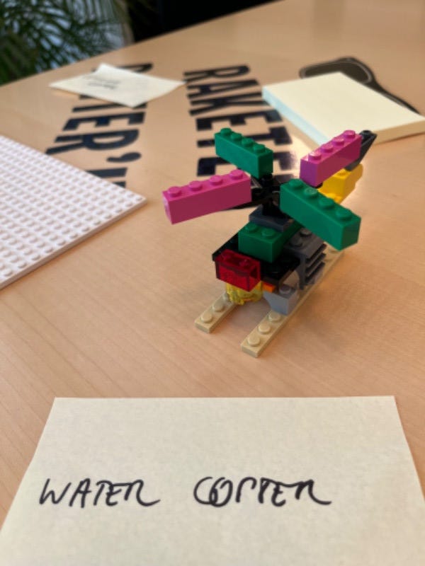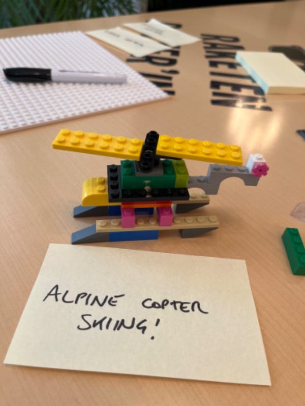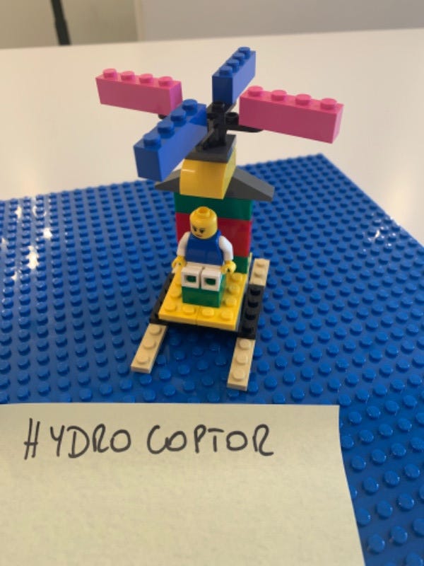 🎲 Inviting them to build a Helicopter out of Lego pieces together (as many as they can imagine, and to write the Helicopter's purpose on a sticky note)