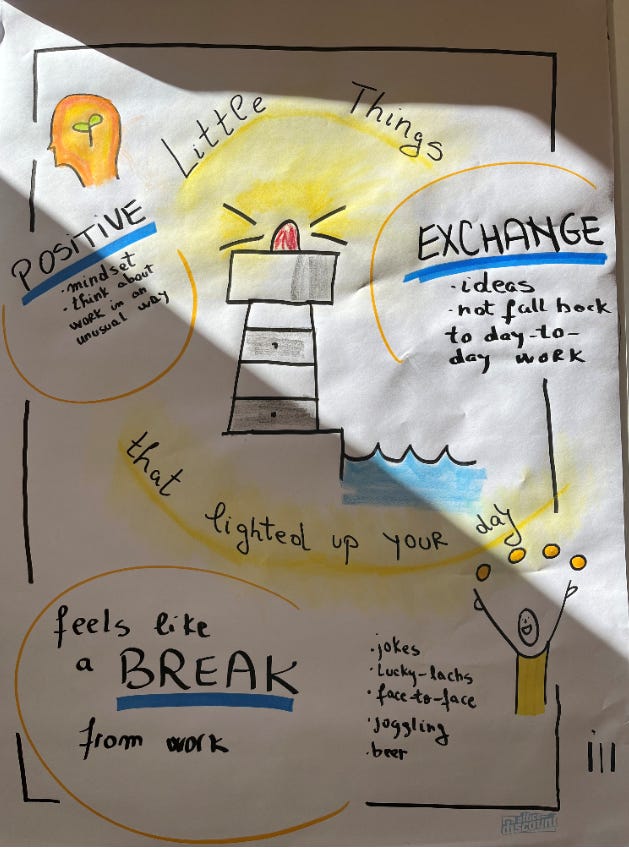 I put myself in the participant’s shoes when I design a session and create an environment where they feel good, have fun, and become creative thanks to this environment. This Innovation Day in the above example was a success, I let you below the feedback of what participants enjoyed, when even if they worked and created their initiatives for the next 6 months, they said “it felt like a break from work” which is amazing!